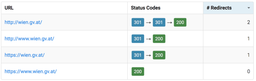 Die normalen http Varianten (www und non-www) sollten via 301 redirect auf die richtige https Version weiterleiten. Die „richtige“ https Version heißt, dass die Website auch über https nur über eine Version erreichbar ist: https://www.example.com oder https://example.com.
