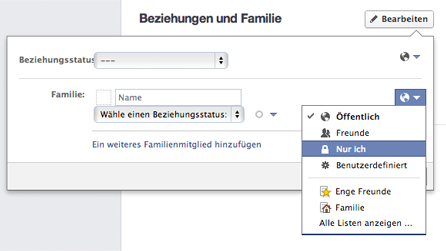 Manche grundlegende Infos wie Name, Geschlecht und Profilbild werden von Facebook zwar grundsätzlich als öffentlich angesehen, aber für alles andere kann das Publikum eingeschränkt werden. Am wichtigsten, weil wohl am sensibelsten, sind die allgemeinen Daten zu Wohnort, Beziehungsstatuts, sexueller Orientierung, Arbeitgebern usw. Diese Informationen sind im eigenen Profil unter “Info” zu finden. Bearbeitet man die Daten (mit Klick auf den Stift im rechten oberen Eck), kann neben jeder Info auch die Sichtbarkeit festgelegt werden.