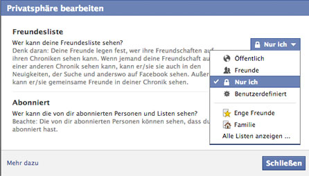 Auch die Sichtbarkeit der eigenen Freundesliste kann reguliert werden. Im Tab “Freunde” im eigenen Profil auf den Stift klicken und den Zugriff auf Freundesliste regeln. So sieht niemand direkt, mit wem man befreundet ist. Da aber Freundschaften auf Facebook nun mal eine Verbindung zweier Nutzer sind, muss auch der Freund seine Freundesliste verborgen haben, um der Graph Search die Information zum Freundesstatus vorzuenthalten.