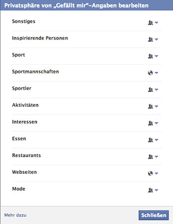 Auf der „Gefällt mir“-Seite wieder ein Klick auf den Stift rechts oben und auf Privatsphäre bearbeiten, schon kann die Sichtbarkeit der Likes – sogar je nach Kategorie – beschränkt werden.