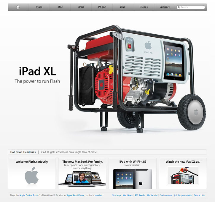 In Zusammenarbeit mit Honda veröffentlichte Apple das iPad XL, das jetzt auch Flash unterstützt. Mit nur einer Tankfüllung können 22,5 Stunden lang flashbasierte Webseiten dargestellt werden.