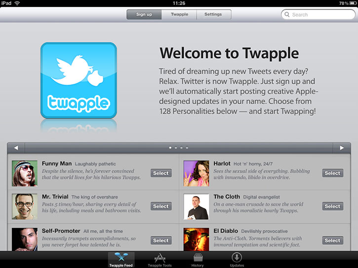 Twitter war kompliziert und zeitaufwändig. Nachdem Apple den Microblogging-Dienst aufkaufte und in Twapple umbenannte ist alles anders. Einfach eine der 128 Persönlichkeiten auswählen, dann läuft das twapplen ganz von alleine.