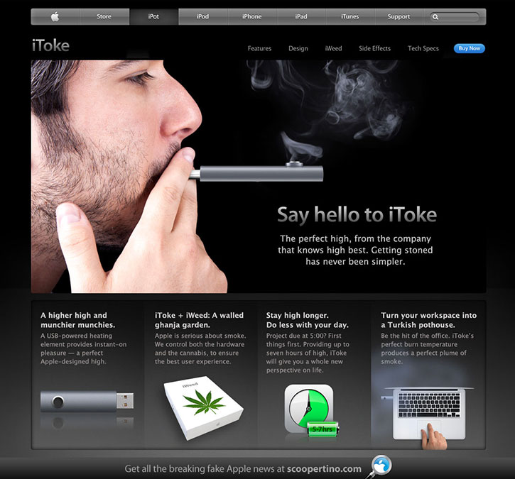 Apple ist konsequent. Auch der iToke ist Teil eines geschlossenen Ökosystems („whalled ganja garden”) und funktioniert nur mit Original iWeed. Dafür sieht er – wie alle Apple-Produkte – besonders gut aus und ist effektiver als ein herkömmlicher Joint.