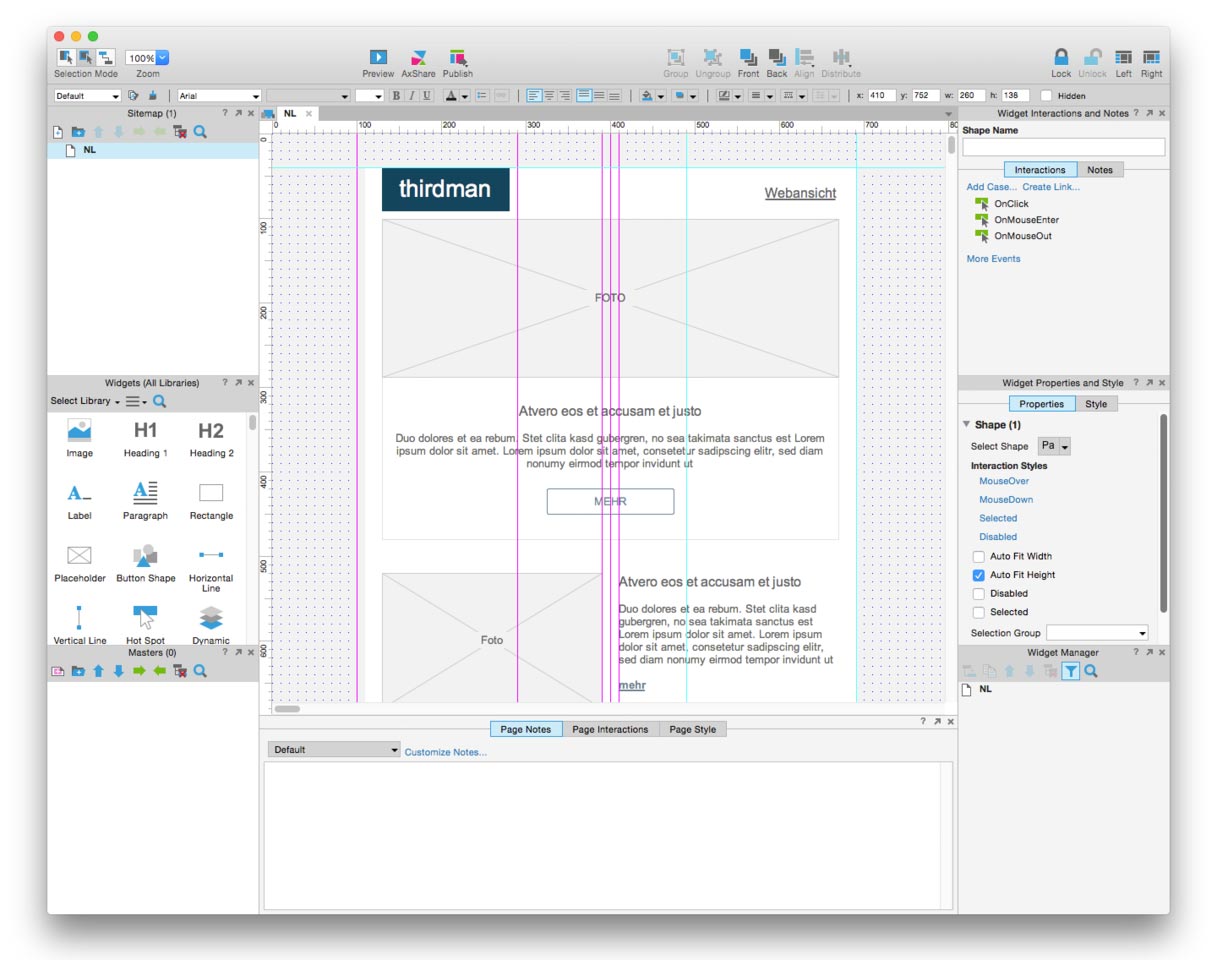 Mit speziellen Programmen – wir etwa arbeiten mit Axure – kann relativ einfach mit vorgefertigten Elementen ein klickbarer Dummy erstellt werden, der bereits einige Funktionalitäten der späteren Website widerspiegelt. Je nach Komplexität der jeweiligen Use-Cases werden entsprechende Teile (etwa Formulare) bisweilen sehr genau abgebildet, immer wieder getestet und optimiert.